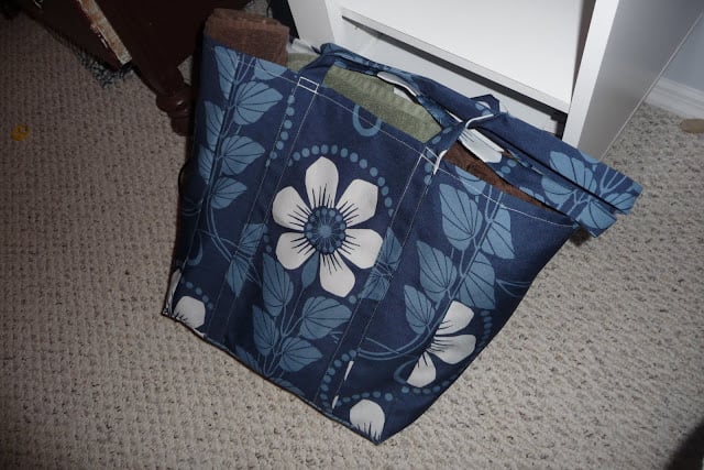 I patterned this one after a reusable shopping bag. It is made from outdoor decorator fabric so it's nice and durable. I sewed this entirely with my serger, except for applying the handles. Serging is so fast.